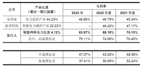 特别是,发行人起家的产品智能网络电力仪表,连最低端的产品毛利率都高于同行: