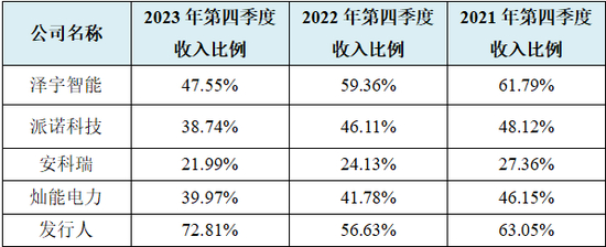 可是,可比公司如泽宇智能、灿能电力的主要客户亦为国家电网,报告期内可比公司各期第四季收入比例不仅低于发行人,而且该比例均呈下降趋势,与发行人的变动相反(详见下表)。