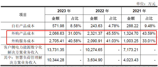 招股书显示,发行人客户侧电力能源数字化解决方案业务实施过程中大量安装、调试、基础建设等工作均采用劳务外包或购买第三方专业服务的方式解决,项目需要用到的外购配套成品包括工业控制设备、IT设备、水表气表、线束线缆等。