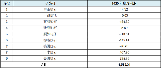 从上表可见,发行人九家子公司中,仅中山影石和一路高飞两家存在几乎可以忽略不计的盈利,其余七家均处于不同的亏损状态,而上述九家子公司2020年度累计亏损近1,600万元,亏损比例数约为77.78%。其中负资产的有顺势电子、香港影石、德国影石、日本影石、美国影石共5家,占比超过50%。