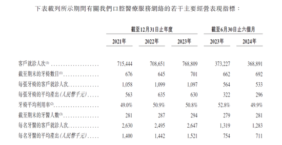 公司还披露有关口腔医疗服务网络的主要经营表现指标,报告期内,客户就诊人次分别为71.54万人、70.87万人、76.88万人、36.89万人;截至期末的牙椅数目分别为676张、645张、701张、692张;牙椅的平均产出分别为56.3万元、63.5万元、63.0万元、29.6万元;平均利用率分别为49.0%、50.9%、50.8%、49.9%;截至期末的牙医人数分别为281名、287名、294名、281名;每名牙医的平均产出分别为140.0万元、144.2万元、152.1万元、71.1万元。