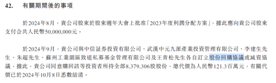 2024年10月8日,大众口腔与中元九派、朱超、中信证券投资、致道资本、李建生及王青松订立股份回购协议,将其持有的全部837.93万股股份购回,总代价为1.21亿元。上述相关款项于2024年10月8日结清。