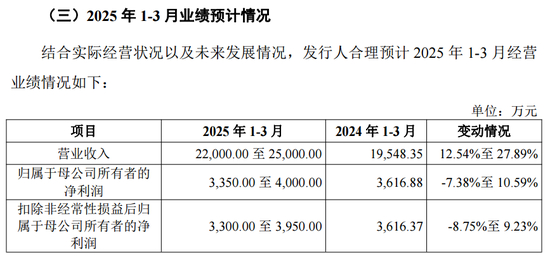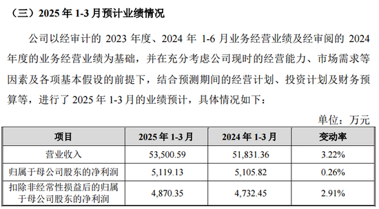 招股意向书显示,毓恬冠佳预计2025年第一季度的营业收入为5.35亿元,同比变动幅度为3.22%;归母净利润为5119.13万元,同比变动幅度为0.26%。