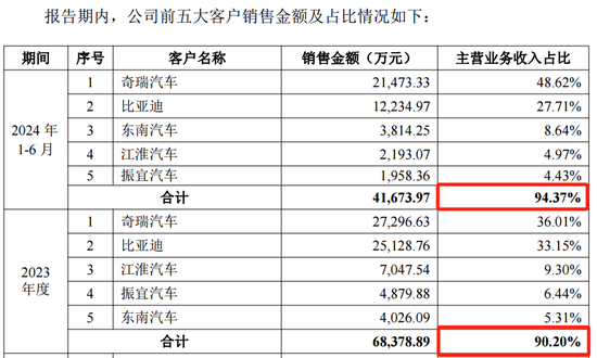 目前,汇通控股的客户主要是自主品牌汽车主机厂,并且集中度较高。2024年上半年,汇通控股前五大客户分别为比亚迪、奇瑞汽车、江淮汽车、振宜汽车、东南汽车,合计销售收入占主营业务收入比例达94.37%。