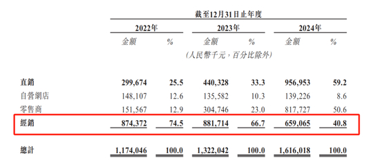 最近几年,公司重点布局直销渠道,在2024年以59.2%的营收贡献率,首次超过经销渠道。其中,零售商在公司收入中的占比,从2021年的12.9%增至2024年的50.6%。