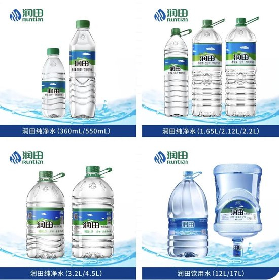 目前,润田旗下主要有“润田”系列饮用纯净水和“润田翠”系列天然含硒矿泉水两大品类。前者主要以1元/瓶(550ml)的亲民价格狙击巨头对本土市场的渗透,当然,也有360ml、1.65L、2.2L、3.2L、4.5L、12L和17L等多种规格来对应不同的消费场景;后者则主要走高品质路线,在其天猫旗舰店,500ml*24瓶的售价为65元,约合2.7元/瓶。