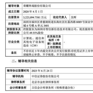 6月26日,据中国证监会网站披露,荣耀获上市辅导备案,辅导券商为中信证券。荣耀首次公开发行股票并上市辅导备案报告显示,其成立于2020年4月1日,注册资本为3223894.7581万元,控股股东为深圳市智信新信息技术有限公司,现直接持有公司49.55%股份,属于计算机、通信和其他电子设备制造业(C39)的行业分类。