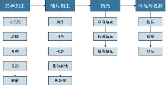 多晶硅拉制成半导体抛光片用硅单晶棒后,经过晶棒加工、硅片加工、抛光、清洗与检测等工序,形成半导体抛光片。后道加工工艺流程如下: