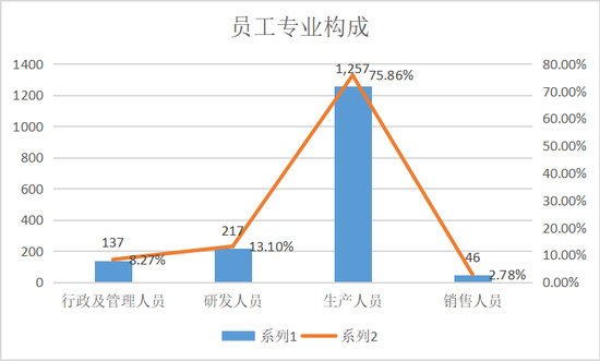 截至2025年6月末,公司及其控股子公司正式员工专业构成情况如下:行政管理人员137人,占比8.27%;研发人员217人,占比13.10%;生产人员1257人,占比75.86%;销售人员46人,占比2.78%。