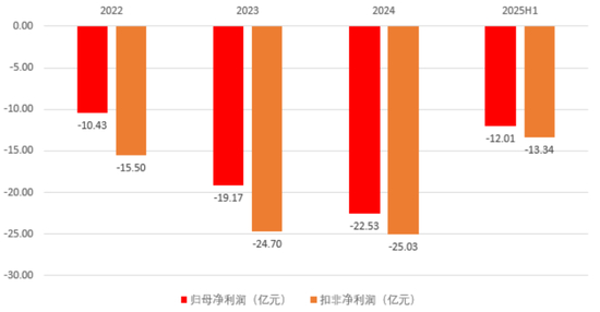 扣非口径下,2022-2024年的累计亏损幅度将进一步放大至65亿。进入2025年后,上半年公司再度录得亏损12.01亿,情况依旧没有好转。