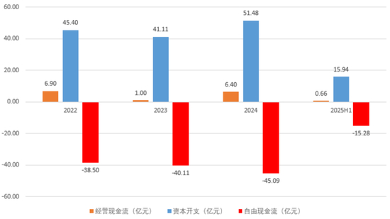 但后来的故事我们都知道了,不仅亏损幅度不断扩大,微薄的经营现金流也难以支撑庞大的资本支出。2022年至2025年上半年的三年半时间内,粤芯股份自由现金流合计净流出近140亿元。