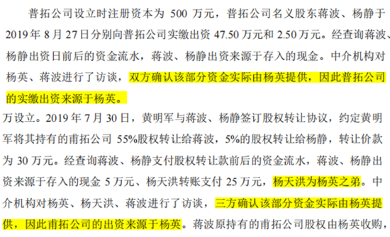 天眼查显示,普拓、甫拓的股东虽登记为蒋波、杨静夫妇,但实际出资人实为双英集团实控人杨英。换言之,这两家公司都是双英集团的兄弟企业,若非中介访谈,明面上还真难发现这层关系。