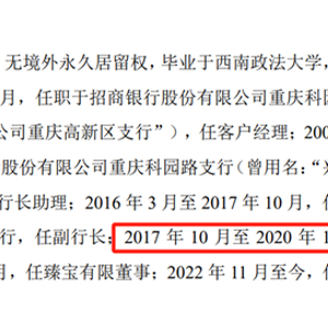 公开信息披露还显示,杨璐对臻宝科技的入股,最早追溯到2019年11月,认缴了新增的787.50万元股份。而当时杨璐的情况,是两年前从华夏银行重庆高新支行副行长位置上退下后,仍处在待业状态,还并未开始担任臻宝科技的董事。