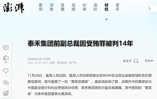 2025年12月,最高院、最高检联合联合发布依法惩治金融领域职务犯罪典型案例,其中披露了一则“黄某受贿案”。