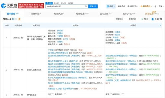 天眼查工商信息显示,近日,吉香居食品有限公司发生工商变更,创始人丁文军卸任法定代表人、董事长兼总经理,徐陈俩接任法定代表人,周志毅接任董事长。同时,原股东丁文军、四川骐汇达科技有限公司等退出,吉香居的公司类型也已由“股份有限公司”相应变更为“有限责任公司”。