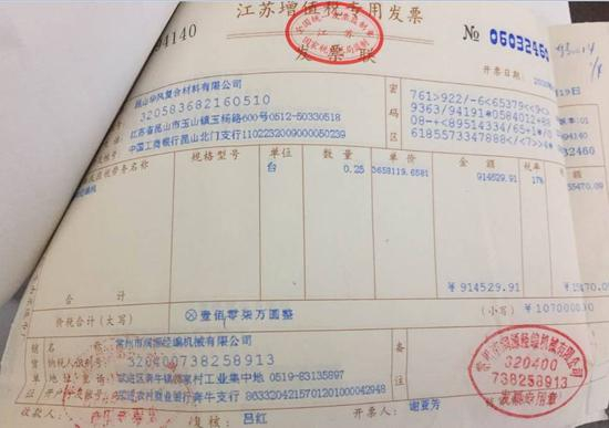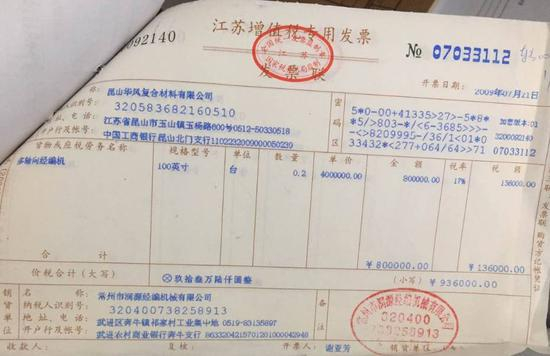 该发票显示,2009年3月润源控股前身常州市润源经编机械有限公司销售给昆山华风的50英寸多轴向经编机,单张发票数量为0.25台,含税价格单价368万元/台。