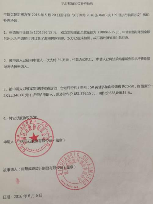 举报人向IPO日报提供了当时双方签署的《补充协议》复印件作为证据,协议中第3点指明,被申请人以该案审理时被查封的一台玻纤织机(型号:50英寸多轴向经编机RCD-50,购置原价:2085348元)折抵给申请人,原协议作价851596.15元,现作价838846.15元。