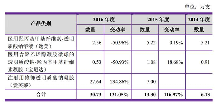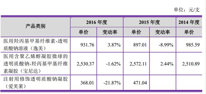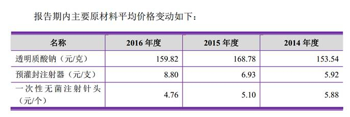 一针玻尿酸,需要三种原材料:透明质酸钠、注射器及注射针头。根据招股说明书显示,2016年采购价格分别为:透明质酸钠159.82元/克、预灌封注射器8.8元/支、一次性无菌注射针头4.76元/个。