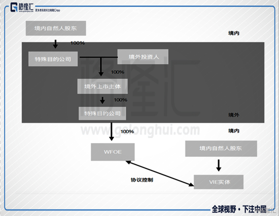 首先,公司创始人或管理团队在离岸金融中心如开曼群岛、英属维京群岛等地设立一个离岸公司;其次,该离岸公司与其他股东(如PE、VC等投资机构等)一起设立一个离岸的壳公司,作为境外上市的主体;该离岸注册的境外上市主体在香港设立一个100%控股的壳公司;然后,该香港壳公司在中国境内设立全资子公司(外商独资企业);最后,该外商独资企业与国内的持牌运营实体通过一系列协议的安排(具体包括控制权、利润转移、股权质押等一系列协议),以实现经济利益的转移。