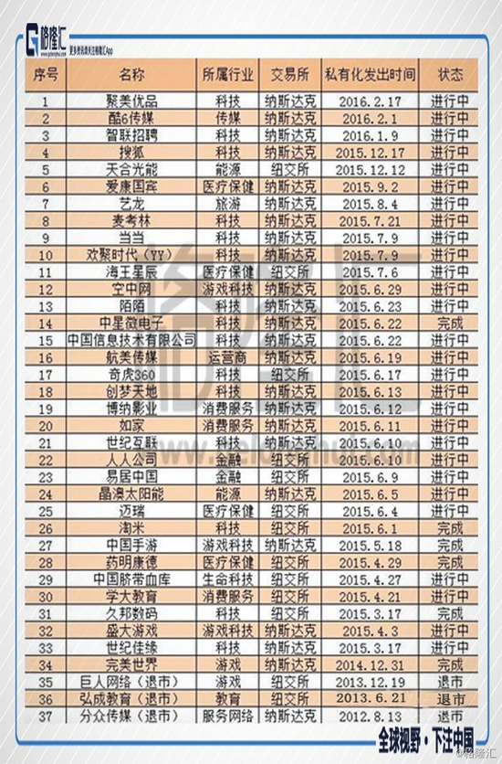 不过,在监管层呼唤独角兽回归A股之前,中概股刚刚从一波低谷中走出来,不少中概股在过去几年中频繁遭到做空机构狙击,纷纷宣布私有化,最多时有40多家中概股接到了私有化要约。