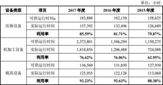 招股书显示,泉峰汽车2015年至2017年自动变速箱类平均产能利用率分别为70.45%、81.18%、83.01%;新能源汽车类平均产能利用率分别为87.61%、93.10%、94.39%。