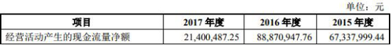 招股书显示,泉峰汽车2015年至2017年经营活动产生的现金流量净额分别为6733.80万元、8887.09万元、2140.05万元,占当期净利润的比例分别为174.48%、160.77%和 28.49%。