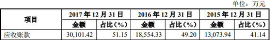招股书显示,泉峰汽车2015年至2017年应收账款账面余额分别为13,748.20万元、19,529.77万元和31,701.33万元;应收账款账面价值分别为13,073.94万元、18,554.33万元、30,101.42万元;占流动资产比例分别为41.14%、49.20%、51.15%;应收账款周转率分别为4.56次、4.42次、3.79次。