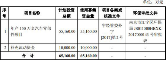 1. 年产150万套汽车零部件项目,计划投资总额55,160.00万元,使用募集资金量55,160.00万元;2.补充流动资金,计划投资总额10,000.00万元,使用募集资金量10,000.00万元。