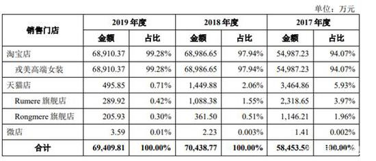 日禾戎美的产品全部通过线上渠道进行销售,目前主要运营一家淘宝门店及两家天猫门店,该淘宝门店为主要收入来源,2019年贡献了99.28%的收入,而两家天猫旗舰店收入不断下降。