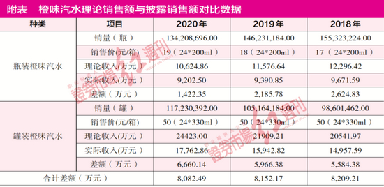按照公司招股书主营业务收入构成环节披露的信息,2020年其瓶装橙味汽水的销售金额为9202.50万元,罐装橙味汽水的销售额则为1.78亿元,两项金额均比上述理论销售收入低了不少,尤其罐装橙味汽水的收入相比理论收入少了6660.14万元,两类包装产品销售合计相比理论收入少了8000多万元,占当年营业收入的1/4左右。