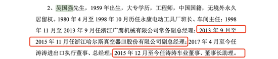 根据招股书显示,吴国强先生,1959 年出生,大专学历,工程师,中国国籍,无境外永久居留权。1980 年 4 月至 1998 年 10 月历任永康电动工具厂班长、车间主任;1998年 11 月至 2013 年 9 月任浙江广鹰机械有限公司常务副总经理;2013 年 9 月至2015 年 11 月任浙江哈尔斯真空器皿股份有限公司副总经理;2017 年 4 月至今任涛涛进出口执行董事、总经理;2015 年 12 月至今任涛涛车业董事、董事长助理。