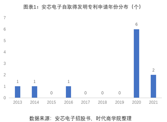 通过分析这些原始取得专利的申请时间,时代商学院发现,安芯电子有突击申报专利冲击科创板的嫌疑,而这些突击取得的发明专利含金量存疑。如图表1所示,安芯电子成立于2012年,2013年开始申请第一个原始取得专利,此后每年申请发明专利数量较少,在2020年之前皆不多于1项,2017—2019年甚至连续三年未新增发明专利。