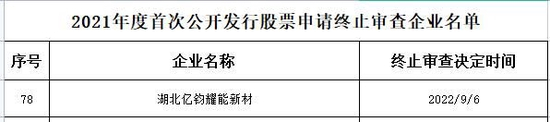 中国经济网北京9月13日讯 据中国证监会网站消息,证监会决定终止对湖北亿钧耀能新材股份公司(以下简称“亿钧耀能”)首次公开发行股票申请的审查。