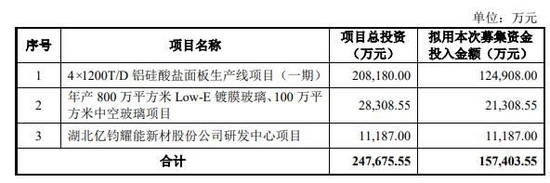 亿钧耀能原拟在深交所主板向社会公众发行不超过38,199,200股的A股(具体以中国证监会核准的股票发行数量为准),本次发行完成后,公司公开发行的股份数将不少于本次发行后公司股份总数的25%。本次发行不涉及公司原有股东公开发售股份。公司拟募集资金157,403.55万元,分别用于“4×1200T/D铝硅酸盐面板生产线项目(一期)”、“年产800万平方米Low-E镀膜玻璃、100万平方米中空玻璃项目”、“湖北亿钧耀能新材股份公司研发中心项目”。