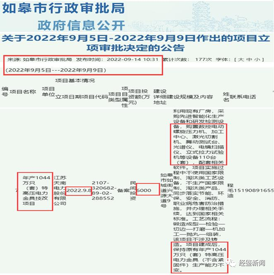 而据如皋市行政审批局2022年9月5日-2022年9月9日作出的项目立项审批决定公告显示,天南电力存在年产1044万只(套)特高压电力金具技改项目,该项目立项日期为2022年9月8日,项目投资6,000万元。