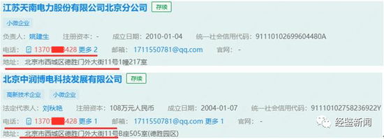 而上述号码,同样是北京中润博电科技发展有限公司(以下简称“中润博电”)的联系电话,中润博电办公地址与天南电力北京分公司也相距很近。