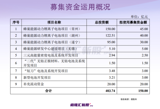 蜂巢能源本次上市募资的大部分资金也是用来扩产,其中包括用于常州、湖州、遂宁的动力锂离子电池项目。