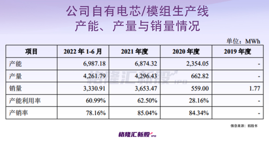 值得注意的是,尽管公司部分产品的产能利用率有所提高,但并未完全饱和。2020年至2022年上半年,公司自有电芯/模组生产线的产能利用率分别为28.16%、62.50%及60.99%。