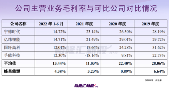由于公司部分产线尚处于产能爬坡阶段,产品单位成本较高。报告期内,蜂巢能源的主营业务毛利率分别为6.64%、0.89%、3.23%、4.38%,远低于同行可比公司均值