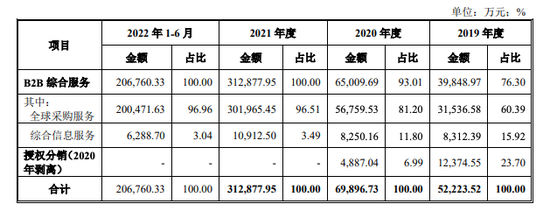 近年来,其主营业务包括B2B综合服务及授权分销服务,后者因分拆上市解决同业竞争需要已于2020年完成整体剥离。而其所谓的B2B综合服务,主要包括全球采购服务和综合信息服务两种形式。其中,全球采购服务以交易的方式通过赚取购销差价实现盈利,综合信息服务则通过收取服务费实现盈利。