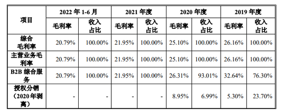 招股书同时透露,报告期内该公司的综合毛利率分别为26.16%、25.1%、21.95%、20.79%;其中,核心业务B2B综合服务的毛利率分别为32.64%、26.31%、21.95%、20.79%。可见,不论是综合毛利率还是核心业务的毛利率,都呈逐年下滑之势。