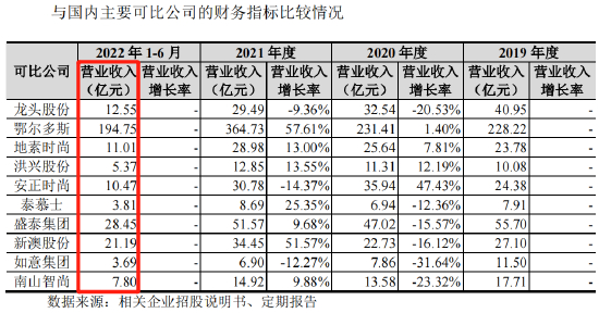 从收入规模来看,羊绒世家可以说是行业垫底。2022年上半年,羊绒世家营收为3.19亿元,低于招股书中披露的同行业公司龙头股份、鄂尔多斯、地素时尚等近十家企业。