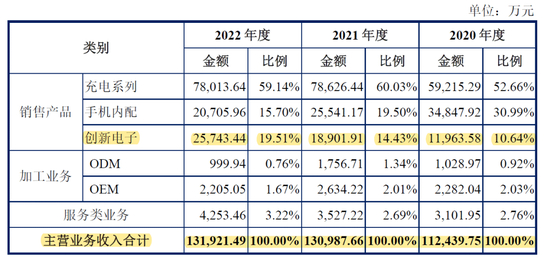 进一步拆分营收结构,充电、手机内配和创新电子三大类产品为贡献主要收入来源。其充电系列产品常年贡献了近6成收入。而值得关注的是,此前一直被品胜电子寄予厚望而打造的第二曲线创新电子类产品,业绩增长比较亮眼,对营收的贡献占比也在不断升高。数据显示,该品类的营收已从2020年的1.2亿元升至2022年的2.57亿元,同期占总营收的比重也从10.64%升至19.51%,成为品胜增长的又一引擎。