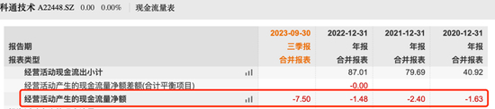 在资产负债率较高的情况下,若公司在经营过程中,能够有充裕的现金流,公司的资金压力也能够有所缓解。但‘创业最前线’注意到,科通技术的经营现金流常年为负数。