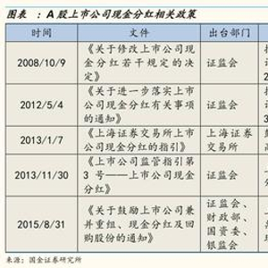 近年来,监管部门多次制定上市公司现金分红相关政策。近期披露的证券法二审草案也要求上市公司应当按照公司章程的规定分配现金股利。我们预计未来或将进一步出台相关政策,规范A股现金分红。