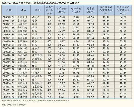 企业现金分红来自于企业当期利润和留存收益,所以我们用企业货币资金占总市值比重和留存收益占总市值比重来刻画企业进行现金分红的潜力。我们筛选出了近五年较少分红(分红频率低于50%),但未来有潜力进行高分红的公司(留存收益占总市值比重和货币资金占总市值比重都排在所有上市公司中前20%的公司)。