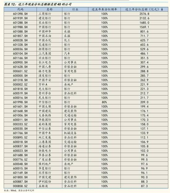 分红总额较大的公司集中在金融、能源和消费等行业。按近三年分红总额排序,排名前 20的公司是:工商银行、建设银行、农业银行、中国银行、中国神华、中国石油、中国石化、交通银行、招商银行、上汽集团、兴业银行、长江电力、中国人寿、格力电器、浦发银行、中国平安、万科A、光大银行、贵州茅台、民生银行。