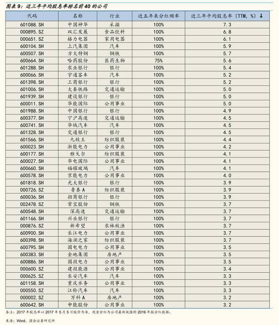 近三年(2015-2017年)平均股息率排名前20的公司是:中国神华、双汇发展、格力电器、上汽集团、方大特钢、哈药股份、农业银行、宇通客车、工商银行、大秦铁路、建设银行、华能国际、中国银行、宁沪高速、华域汽车、交通银行、九牧王、浙能电力、雅戈尔、华电国际。