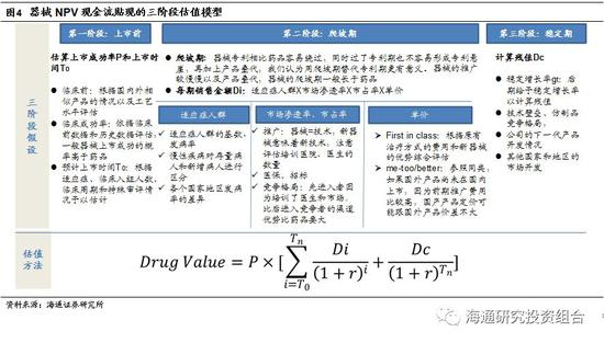 我们认为当前通行的创新器械估值还是NPV现金流折现,基于风险调整现金流折现估值法。与创新药相比,我们认为创新器械的估值有三大不同: