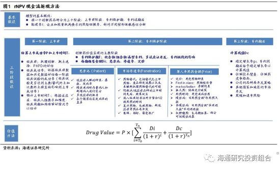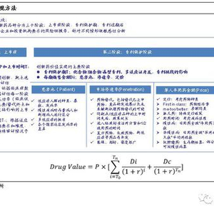 创新药产品线估值的“金标准”——rNPV(基于风险调整的现金流折现法)。相比于一般绝对估值方法,rNPV将技术性风险从折现率中独立出来,更加适合高风险的创新药产品线估值。该方法把一个创新药品种分为上市前、专利保护期、专利过期后3个阶段,药品上市成功率P可根据可比项目的临床前、临床阶段成功率进行估算,贴现率r则需要针对不同情形做敏感性分析。